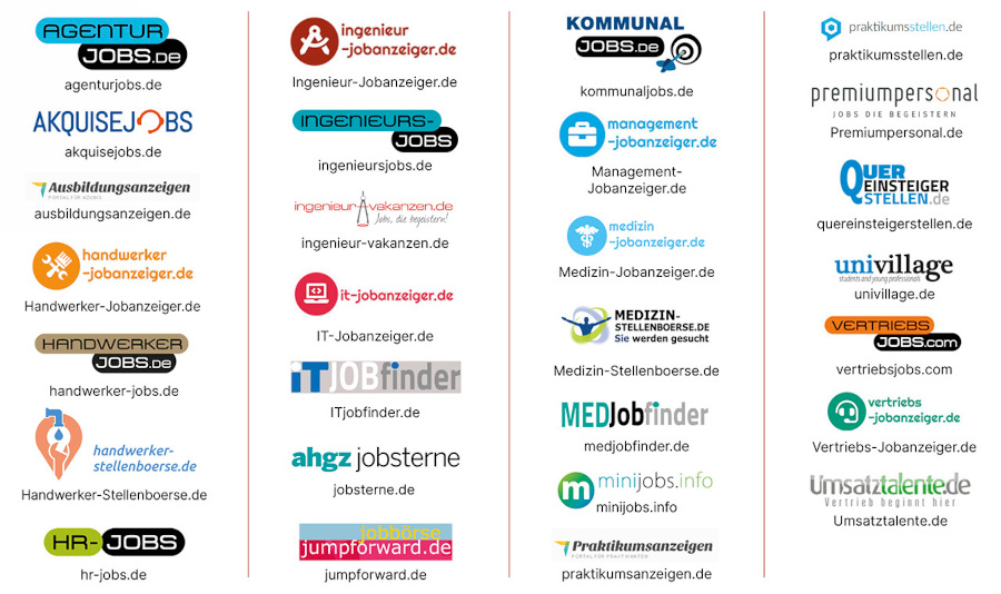 Um potentiell geeignete Fachkräfte gezielt anzusprechen, betreibt JobNinja bundesweit zahlreiche eigene Fachportale (z.B. altenpflegerjobs.com, handwerkerstellen.com, jobsimhomeoffice.de etc.) und arbeitet mit renommierten Branchen-Fachportalen zusammen.